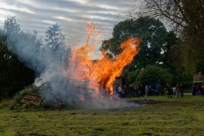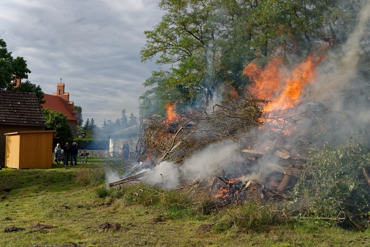 Unter der Beobachtung der Freiwilligen Feuerwehr Krien um ihren Wehrführer Robert Bast wurde der große Holzhaufen in Brand gesetzt und löste sich innerhalb von wenigen Stunden in Feuer und Rauch auf. Der Wettergott meinte es gut mit uns und hielt den Wind im Zaum. Die Sonne strahlte und es war ein schöner Samstag im Oktober 2021.