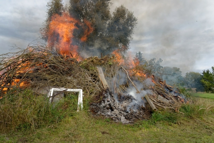 Zu Ostern 2019 war ein großes Osterfeuer geplant. Holz wurde auf dem Wegeziner Bolzplatz angeliefert. Manches gewollt und anderes wohl notgedrungen. Der Holzhaufen wurde von Tag zu Tag größer! Und dann kam Corona! 2 Jahre lang hatte das Holz nun Zeit sich für den großen Tag vorzubereiten.