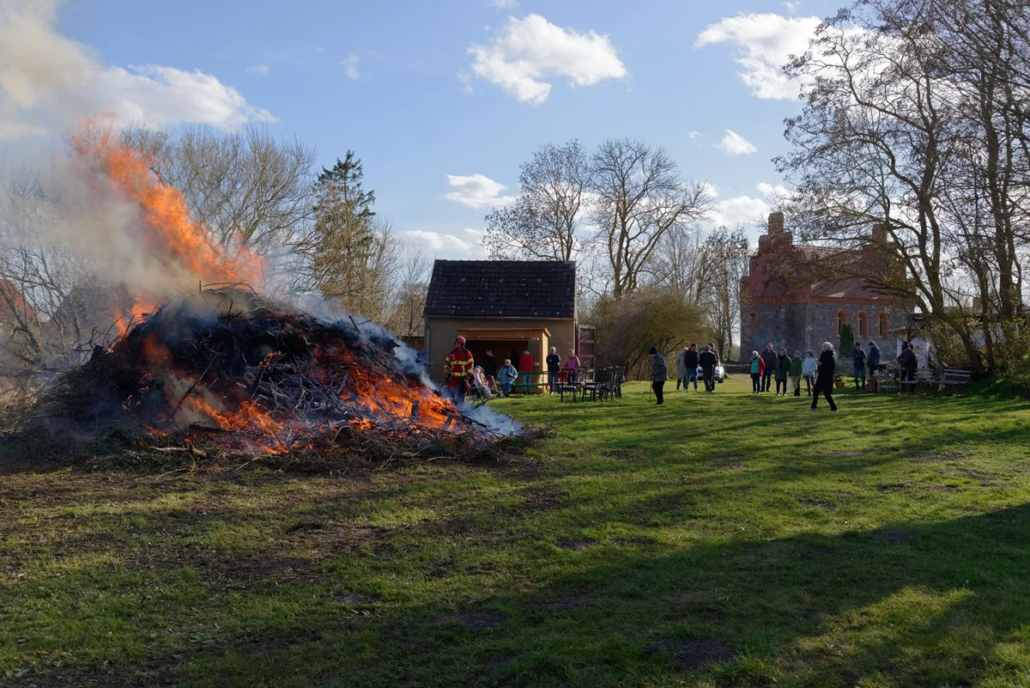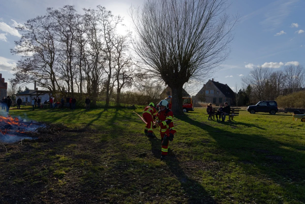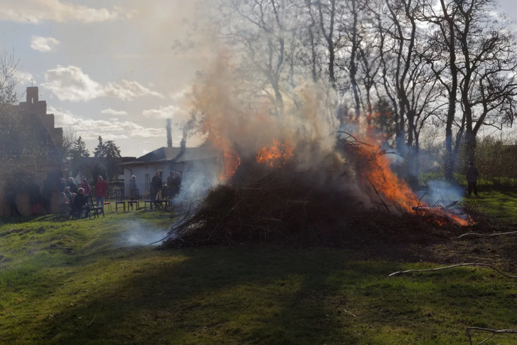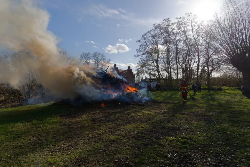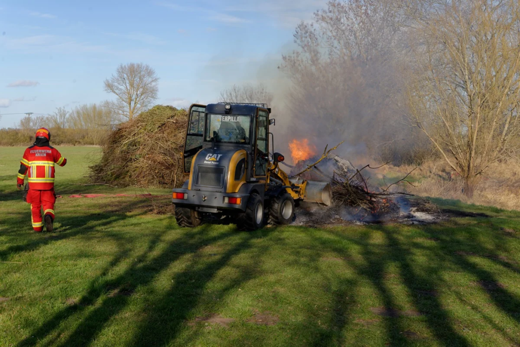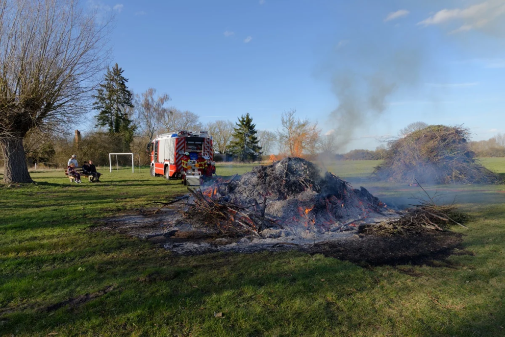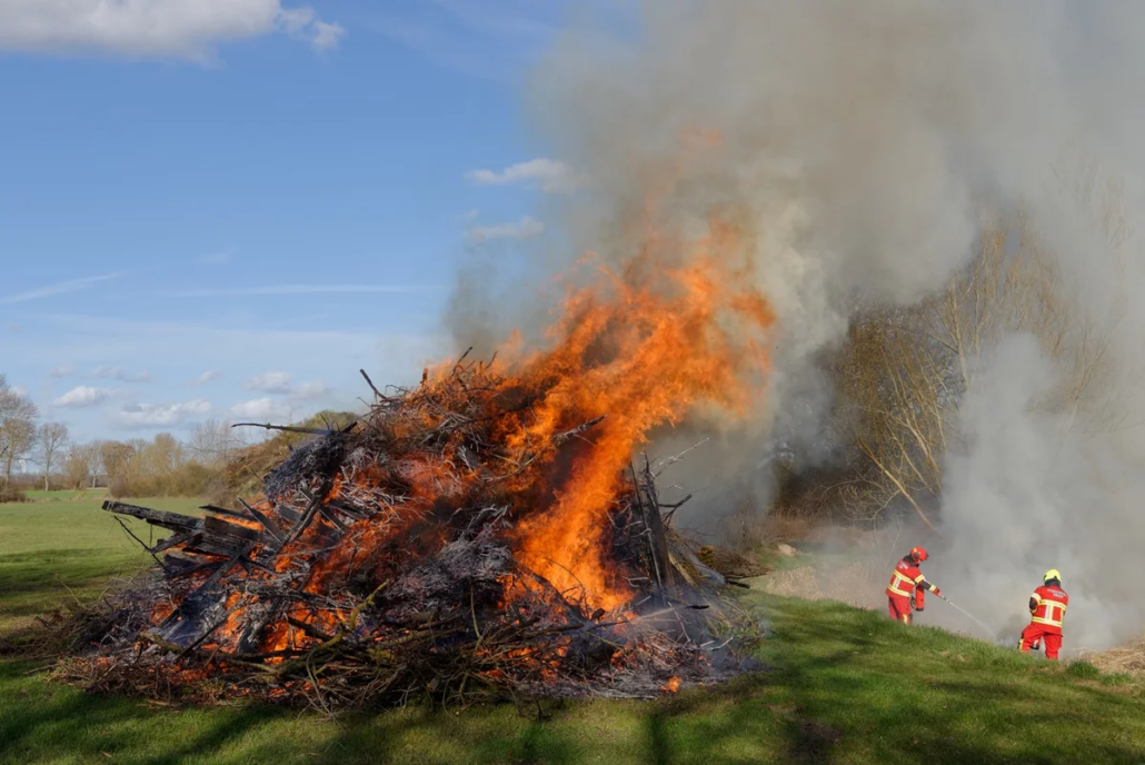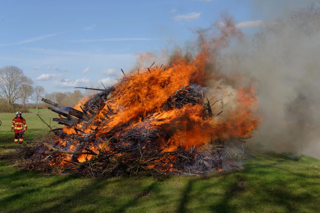 Am Ostersamstag um 17:00 Uhr erwartete uns sonniges Frühlingswetter mit einer leichten Brise, als die Kriener Feuerwehr das Osterfeuer entzündete. Schon nach kurzer Zeit loderten meterhohe Flammen und verschlangen den großen Holzhaufen. Es war beeindruckend – und auch lehrreich – zu sehen, wie Feuer selbst über 20 Meter hinweg Funken schlagen und an anderer Stelle neu entfachen kann. Doch die Kriener Feuerwehr hatte alles sicher im Griff. Svenja zeigte in ihrem neuen Schutzanzug vollen Einsatz – großartig!