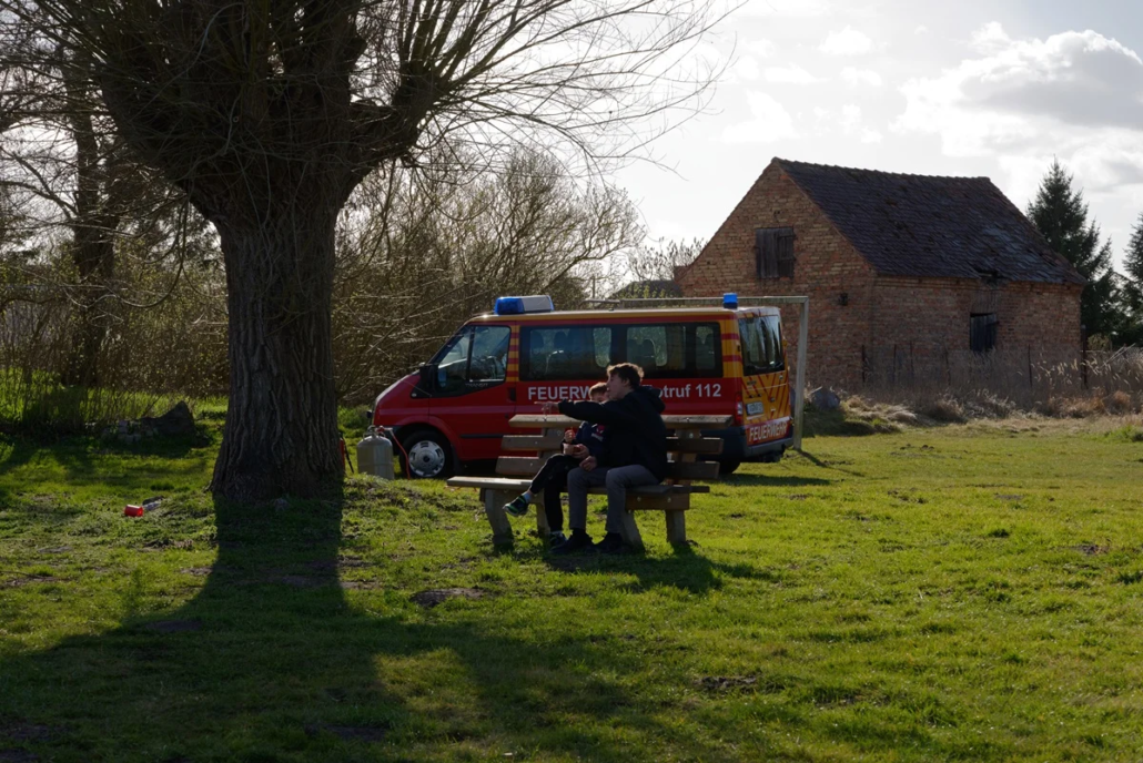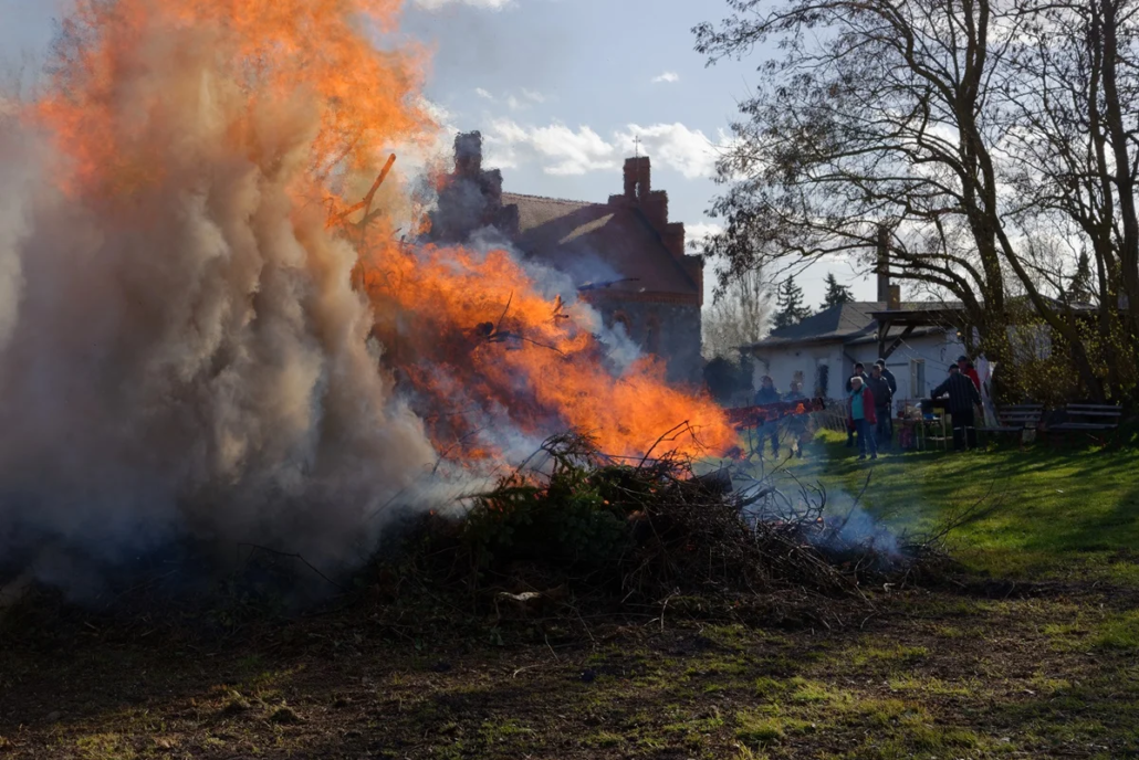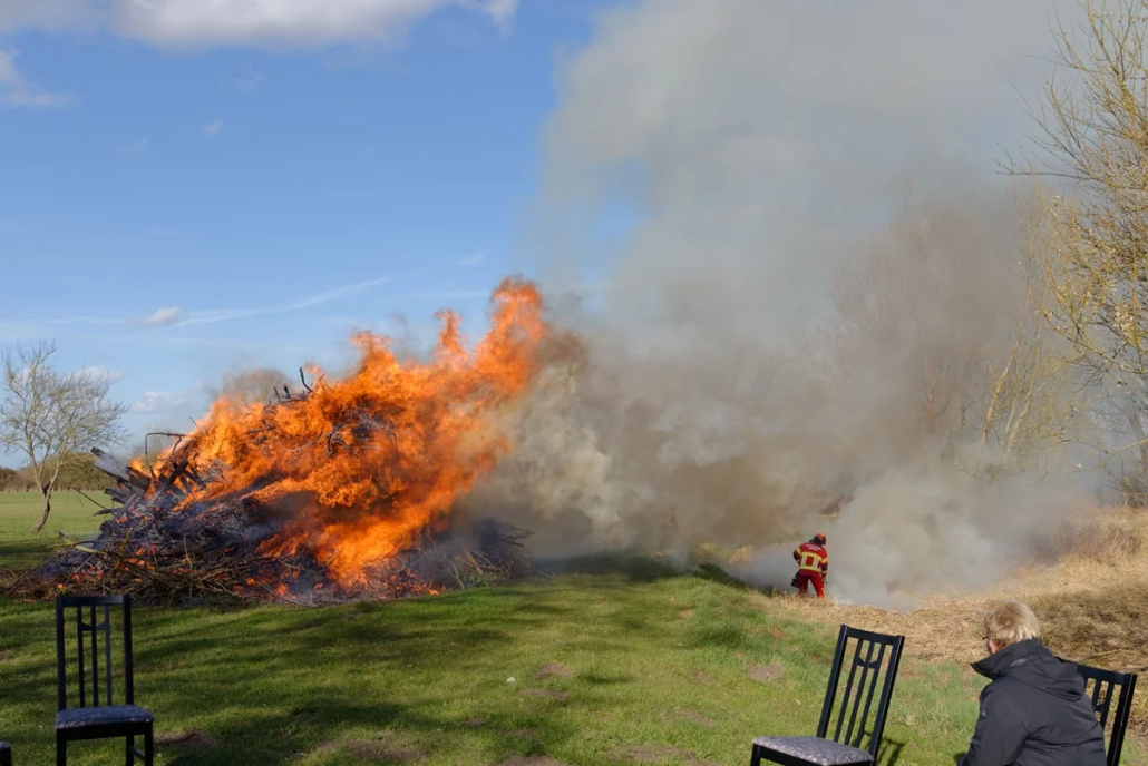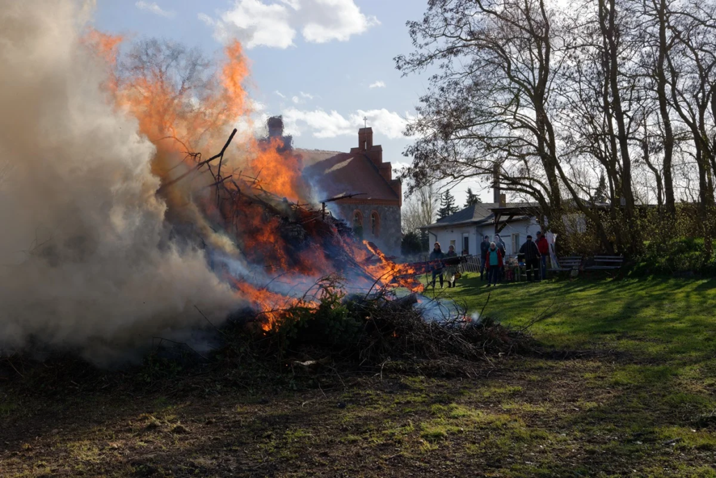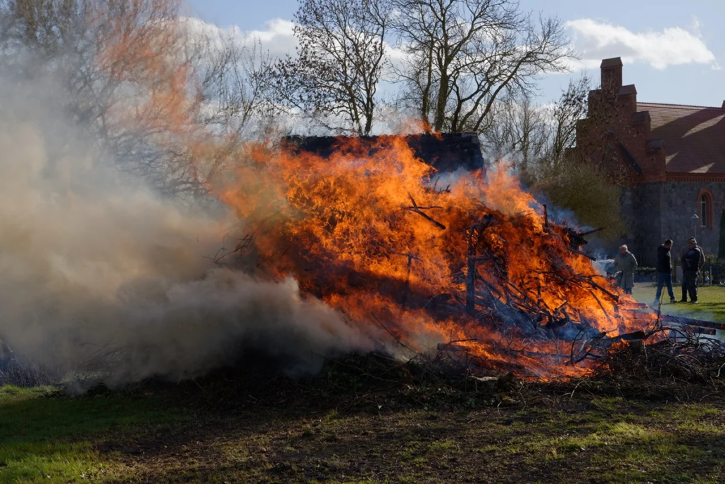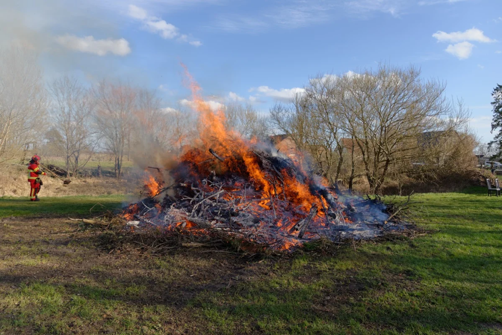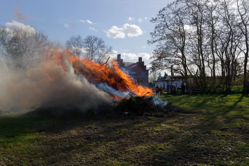 Am Ostersamstag um 17:00 Uhr erwartete uns sonniges Frühlingswetter mit einer leichten Brise, als die Kriener Feuerwehr das Osterfeuer entzündete. Schon nach kurzer Zeit loderten meterhohe Flammen und verschlangen den großen Holzhaufen. Es war beeindruckend – und auch lehrreich – zu sehen, wie Feuer selbst über 20 Meter hinweg Funken schlagen und an anderer Stelle neu entfachen kann. Doch die Kriener Feuerwehr hatte alles sicher im Griff. Svenja zeigte in ihrem neuen Schutzanzug vollen Einsatz – großartig!
