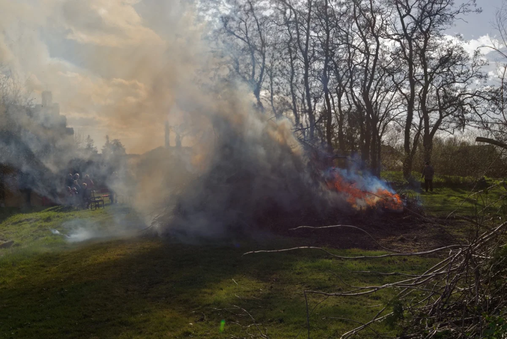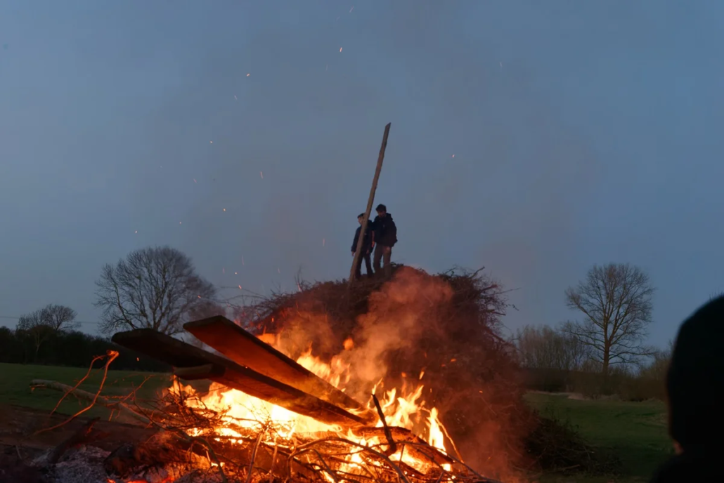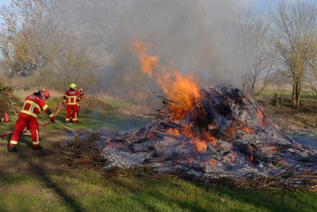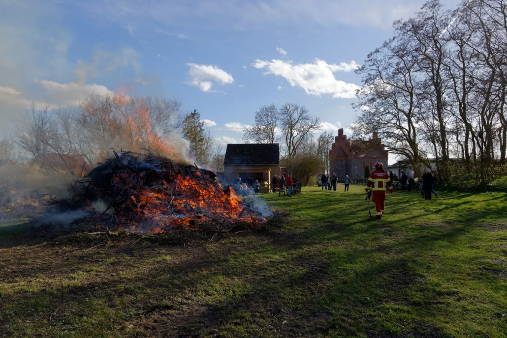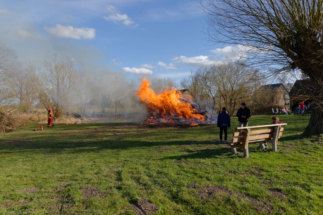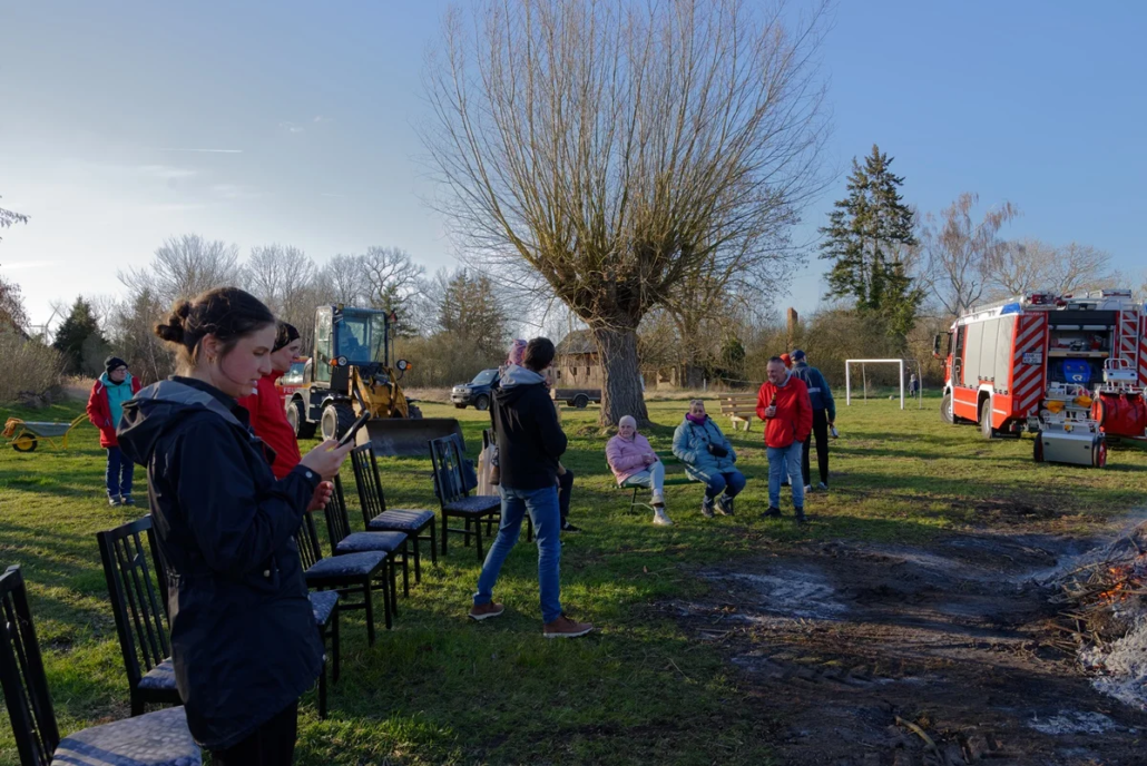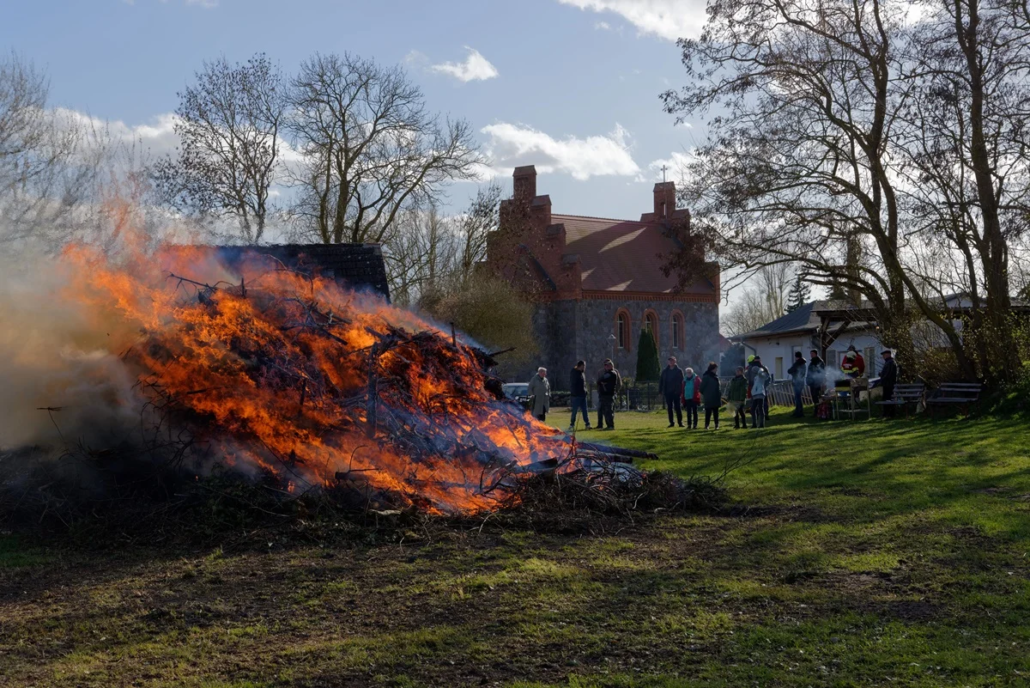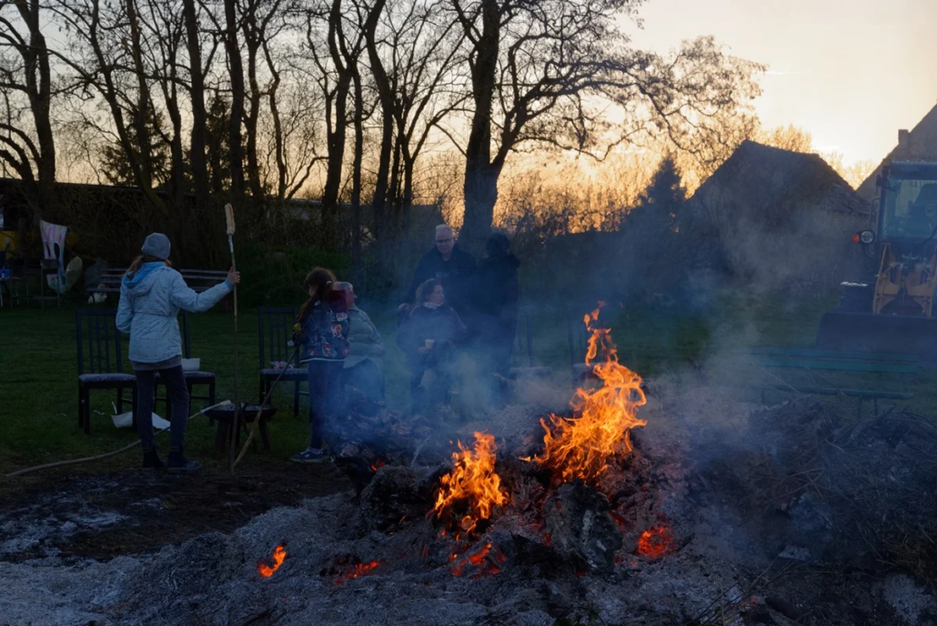 Am Ostersamstag um 17:00 Uhr erwartete uns sonniges Frühlingswetter mit einer leichten Brise, als die Kriener Feuerwehr das Osterfeuer entzündete. Schon nach kurzer Zeit loderten meterhohe Flammen und verschlangen den großen Holzhaufen. Es war beeindruckend – und auch lehrreich – zu sehen, wie Feuer selbst über 20 Meter hinweg Funken schlagen und an anderer Stelle neu entfachen kann. Doch die Kriener Feuerwehr hatte alles sicher im Griff. Svenja zeigte in ihrem neuen Schutzanzug vollen Einsatz – großartig!