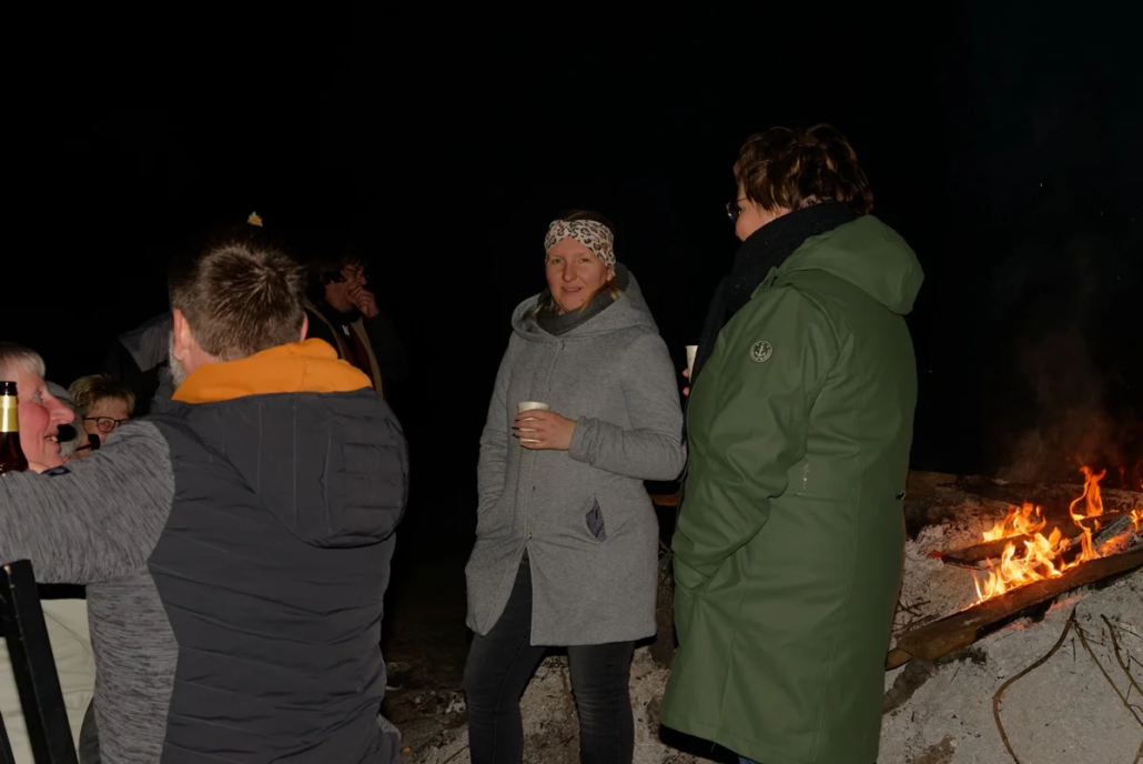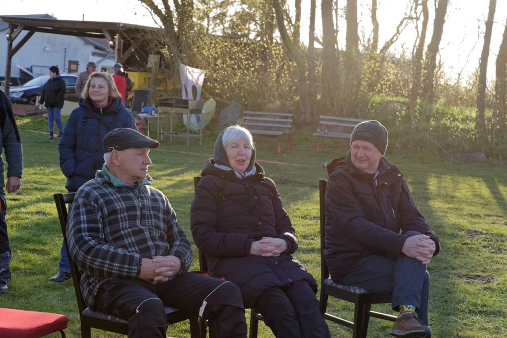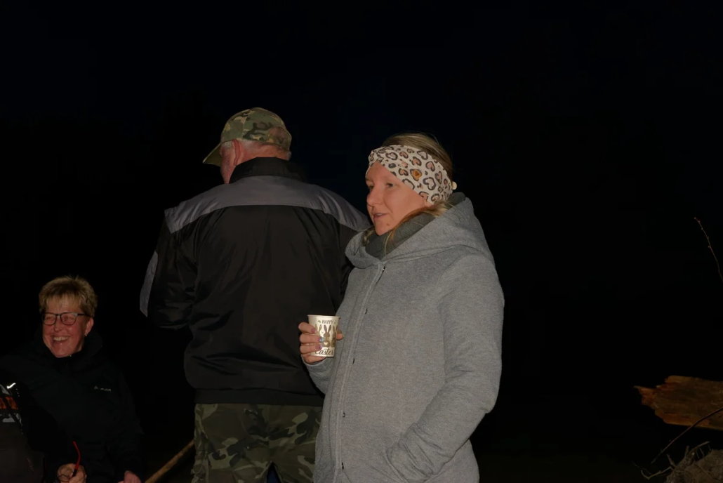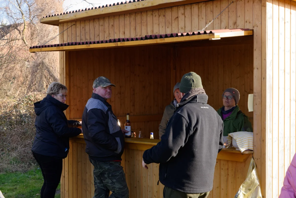 Etwa eine Stunde später war der Wind mild, der Himmel klar – und die Stimmung rundum entspannt. Für das leibliche Wohl war bestens gesorgt: Bratwurst mit Brot, dazu Bier, Prosecco, Cola und Wasser. Ralf & Horst am Grill sowie Moni & Doris an der Getränkeausgabe hatten alles fest im Griff. Dank Ellen gab es auch Glühwein und Hubertus Tropfen gegen Alltagskrankheiten.